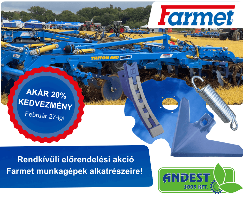 Az ANDEST-2005 Kft. előrendelési akciót hirdet Farmet munkagépek alkatrészeire, amelynek keretében megrendeléseiket akár 20%-os mértékű kedvezménnyel érvényesíthetik az érvényben lévő hivatalos árjegyzékhez képest.